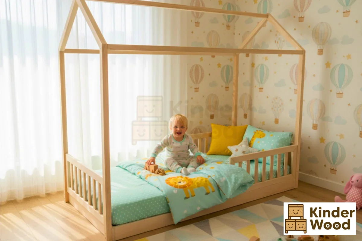 Doğal ahşap dokusu ve yere yakın yapısıyla bağımsız uyuma alışkanlığı kazandırır.